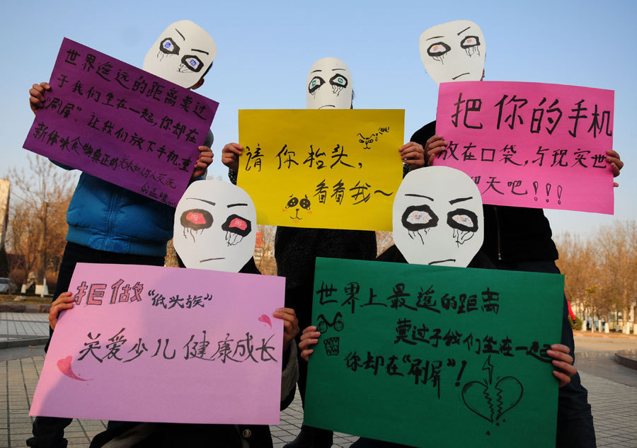 Students hold up placards reading: "The longest distance in the world is that we sit together, but you are playing with your phone"; "Please raise you head and look at me" etc. [Photo by Zhang Zhenxiang/Asianewsphoto]