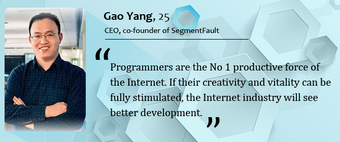 Listed as one of "China's 30 under 30" by Forbes last year and initiator of China's hackathon – an event gathering programmers to collaborate on software-related projects - Gao Yang sometimes generates more attention from his past experiences than for his business project.