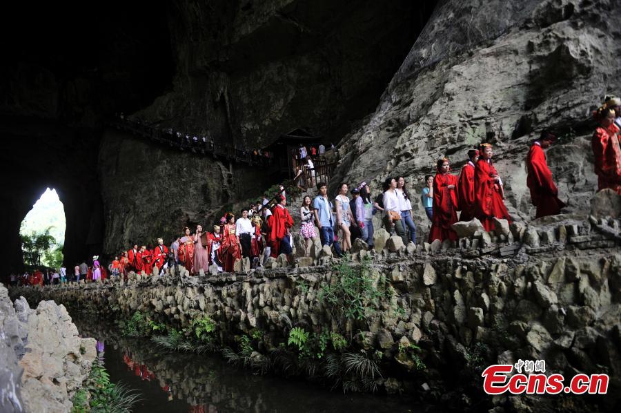 Ninety-nine brides and grooms dressed in Hanfu, traditional clothing of the Han Chinese people, attend a group wedding ceremony at the Taohuayuan scenic spot in Southwest China's Chongqing municipality during the May Day holiday. [Photo/Chinanews.com]
