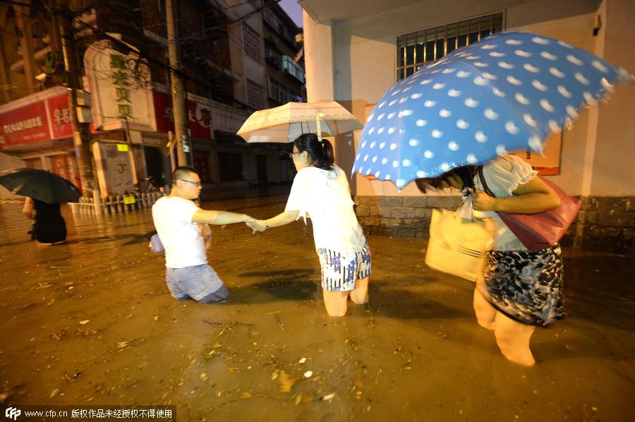 People walk across a flooded street as torrential rain hit Jinan, capital of East China's Shandong province, on Aug 3. The precipitation reached 70 mm within two hours and water reached one meter in some areas. [Photo/CFP]