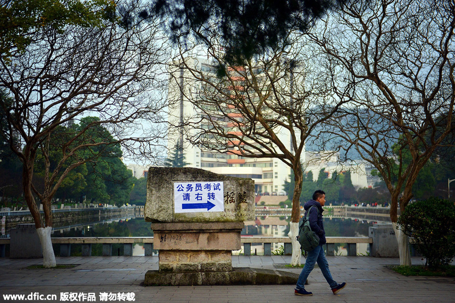 Liu Hongyuan walks on his way to the exam center in Xi'an city, Northwest China's Shaanxi province, on Nov 29, 2015. [Photo/IC]