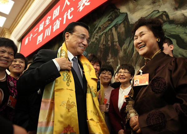 Li wears a hada presented by Sichuan delegates during a group discussion at the third session of the 12th National People's Congress, in Beijing, March 8. [Photo by Wu Zhiyi/Asianewsphoto]