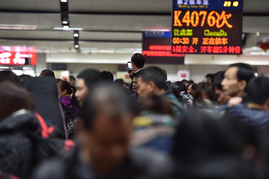 Crowds of passengers queue to board a train as the Spring Festival travel rush begins at Shenzhen, South China's Guangdong province, Jan 24, 2016. [Photo/Xinhua]