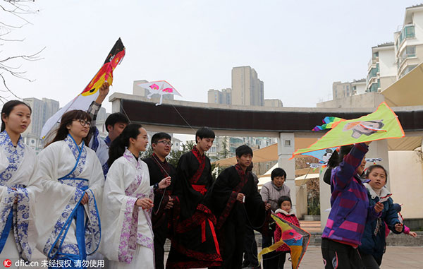 Students in Han Dynasty outfits from Nantong Open University and pupils fly a kite to celebrate the coming of spring, in Chongchuan district, Nantong city, Jiangsu province, March 20, 2016. [Photo/IC]
