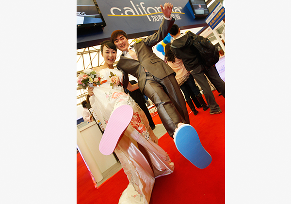 At a Shanghai travel agency, a newly-married couple celebrate the start of their honeymoon travel to the United States.[Photo provided to China Daily]