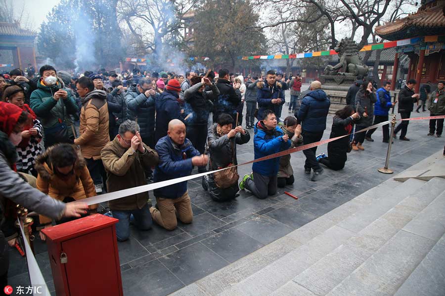 Devout visitors kneel at the Yonghegong Lama Temple in Beijing as they pray for good fortune in the Year of the Rooster, Jan 28. [Photo/IC]