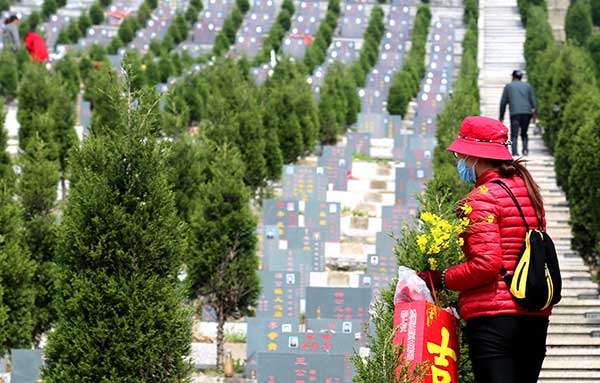 A woman pays her respects at a graveyard in Wenling, Zhejiang province, on Tuesday.[JiN Yunguo/For China Daily] |