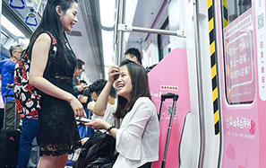 Passengers enjoy a light moment in a compartment prepared especially for singles on Line 1 of the Shenzhen Subway in Guangdong province on May 8.[Mao Siqian/Xinhua] |