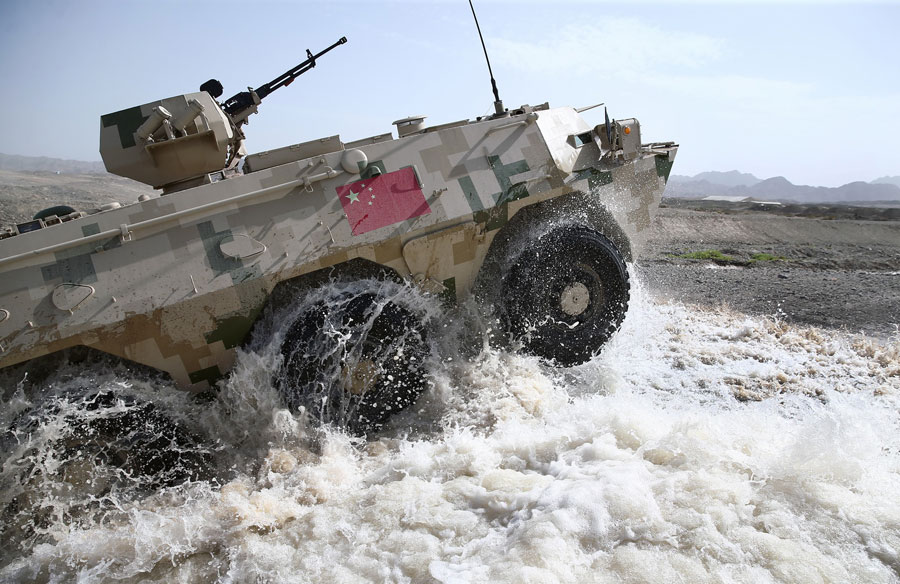 An infantry fighting vehicle of the PLA Army drives through water during a drill. [Photo by Zou Hong/chinadaily.com.cn] |