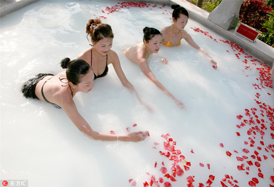 Women play in a hot spring with milk in Huangshan, Anhui province Nov 18, 2013. [Photo/IC]