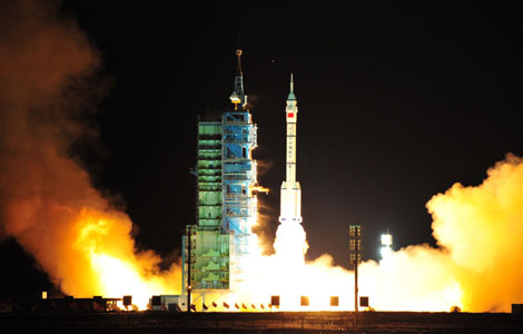A modified model of the Long March CZ-2F rocket carrying the unmanned spacecraft Shenzhou-8 blasts off from the launch pad at the Jiuquan Satellite Launch Center in northwest China's Gansu Province, Nov. 1, 2011.[Photo/Xinhua]