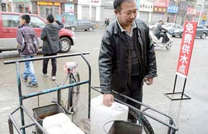About 9,000 people in a northeastern China county have to line up in front of temporary water supply stations to get drinking water after their tap water was found polluted, authorities said Sunday.