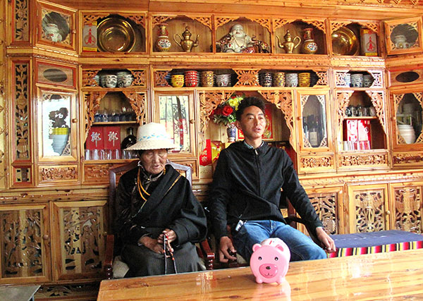 Zamrenzo sits with his grandmother in the living room of their new home in Muchang village, Songpan county, Aba. The 19-year-old ethnic Tibetan has turned the house into family hotel to provide accommodations for tourists. [Photo by Li Yang/China Daily] |