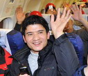 Migrant workers gesture on their chartered flight at the airport in Hangzhou, capital of east China's Zhejiang Province, Feb. 4, 2010.