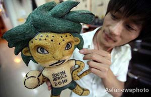Huang made the green-haired leopard mascot and some football stars from 1.4 kilograms of discarded hair, in an effort to celebrate this year's World Cup opening. Huang finished the projects in two months, which included the process of cleaning, color fading and dyeing the hair.
