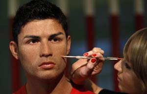 A sculptor works on a wax figure of Portugal's soccer player Cristiano Ronaldo at Madame Tussauds in London June 9, 2010.