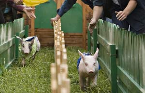 Piglets take part in the pig races during an agricultural exhibition near the village of Liavonavichi, some 10 km (6 miles) north of the capital Minsk, June 8, 2010.