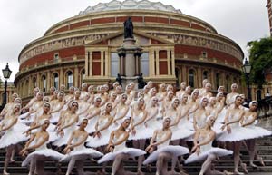 Sixty English National Ballet dancers from the current production of Swan Lake pose a day before its opening outside the Royal Albert Hall in London June 8, 2010.