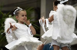 Five-year-old girls dance on the shoulders of women during the "Coca" celebration in Redondela in rural northeastern Spain June 6, 2010.