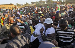 At least 10 people, including a South African policeman, were injured during a stampede ahead of a FIFA World Cup friendly game between Nigeria and the Democratic People's Republic of Korea at a stadium east of Johannesburg on Sunday.
