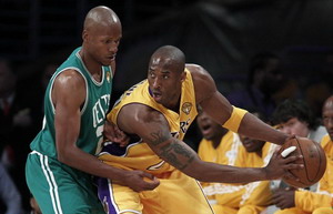 Kobe Bryant and the Los Angeles Lakers produced a sizzling display at both ends of the court to beat the Boston Celtics 102-89 in Game One of the NBA Finals on Thursday.
