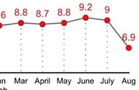China's value-added industrial output expanded 6.9 percent year on year in August, down from the 9-percent growth in July, the National Bureau of Statistics said on Saturday.