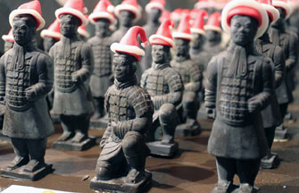 Pastry chefs of a hotel in Xi'an have turned 100 kilograms of chocolate into miniatures imitative of members of the Terracotta Army, a set of lifesize ancient Chinese army sculptures from the 3rd century B.C..