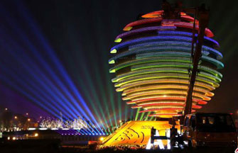 An APEC emblem-shaped light is turned on at an intersection in the Chaoyang district of Beijing on Wednesday evening, October 29, 2014.