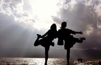 Cyclists take photos on the bank of the Erhai Lake in Dali Bai autonomous prefecture, southwest China's Yunnan province.