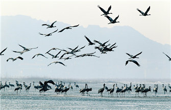 Photo shows the migratory birds flying over the Shengjin Lake, Chizhou city, East China's Anhui province.