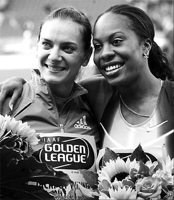 Russia's Yelena Isinbayeva (left) and Sanya Richards of the US celebrate after winning the ISTAF Golden League athletics in Berlin. Isinbayeva and Richards will share the $1m jackpot after they both recorded their sixth consecutive Golden League win of the season. AFP |