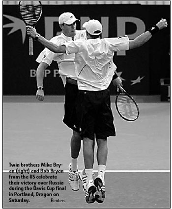 In Portland, the crowd-pleasing, chest-bumping Bryan brothers crushed Russians Nikolay Davydenko and Igor Andreev 7-6, 6-4, 6-2 to give the Americans an unbeatable 3-0 lead in the best-of-five match final.