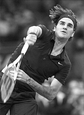 Roger Federer of Switzerland serves to Pete Sampras of the US during their exhibition tennis match at New York's Madison Square Garden on Monday. Reuters |