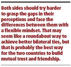 Both sides should try harder to grasp the gaps in their perceptions and face the differences between them with a flexible mind-set. That may seem like a roundabout way to achieve better bilateral ties, but that is probably the best way for the two countries to build mutual trust and friendship.