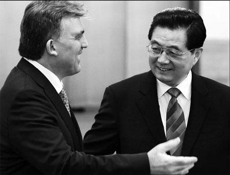 President Hu Jintao chats with visiting Turkish President Abdullah Gul in Beijing yesterday. Wu Zhiyi