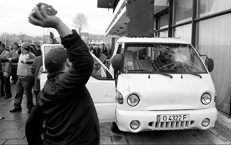 An interim government follower throws a stone at a pick-up truck transporting equipment for the rally and owned by supporters of Kyrgyz President Kurmanbek Bakiyev, at a square in Kyrgyzstan's southern city of Osh on Thursday. Denis Sinyakov / Reuters |