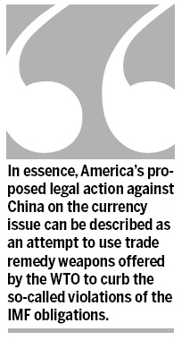 The latest US attempt is centered on how to link the so-called Chinese currency problem to its America's internal legal framework. In other words, it wants to lay down the legal basis for imposing anti-dumping and countervailing measures on Chinese imports for the so-called currency manipulation.