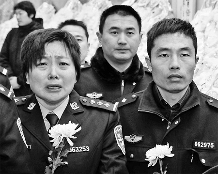 Police officers in Tai'an city of Shandong province attend a remembrance ceremony on Friday at a local cemetery hall in honor of three law enforcement officers who died on Jan 4 chasing two gunmen. Yan Ming / for China Daily |