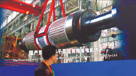 A visitor looks at the first domestic 1 million kilowatt nuclear generator rotor at a recent international nuclear power equipment exhibition in Beijing. China is expected to attain a nuclear power generation capacity of 11.74 gigawatts by the end of 2011, says the National Energy Administration. Wu Changqing / For China Daily |