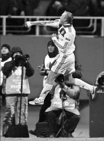 Dynamo Kiev's Oleh Gusev celebrates after scoring against Manchester City during their Europa League match at the Valeriy Lobanovskiy stadium in Kiev on Thursday. Kiev won 2-0. Gleb Garanich / Reuters |