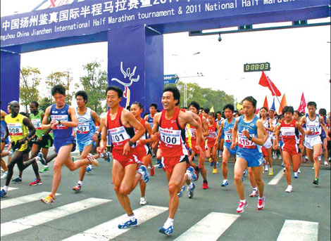 Runners go through the starting line at the Yangzhou Jianzhen International Half Marathon on Sunday morning in Yangzhou, Jiangsu province. Deriba Ejigu of Ethiopia won the men's title, while his compatriot Mare Dibaba Hurssa crowned the women's. Cui Jiaming / China News Service |