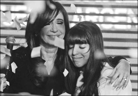 Argentine President Cristina Fernandez de Kirchner is embraced by her daughter Florencia after hearing the first results of the nationwide primary election in Buenos Aires on Sunday. Enrique Marcarian / Reuters |