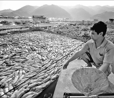 A fisherman in Gutian county, Fujian province, checks his pond, which is covered by dead fish. Wei Peiquan / Xinhua |
