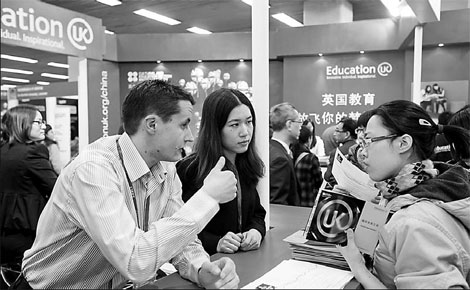 Visitors discuss university courses in the United Kingdom with an exhibitor at the 17th China International Education Tour Exhibition in Beijing on March 10. Around 400 universities and educational institutions from more than 30 countries and regions, including Australia, the UK, France and the United States, took part in the event. The uncertainties over securing a job after the post-study working visa is abolished may deter Chinese students from choosing British universities. Provided to China Daily |