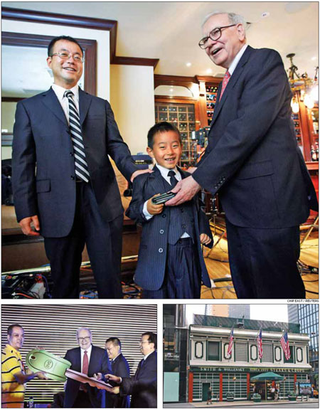 Clockwise from top: Hedge fund manager Zhao Danyang and his son Zhao Ziyang with billionaire investor Warren Buffett after placing the winning bid in a charity auction for lunch with Buffett. Buffett, the chairman of Berkshire Hathaway, handed his wallet to the younger Zhao and then whispered a stock tip after completing a series of television interviews. Buffett's power lunch is traditionally held at the high-end New York steakhouse, Smith & Wollensky. The restaurant donates $10,000 to the charity Glide for the pleasure of hosting the event annually. Warren Buffett and Wang Chuanfu, CEO of the auto and battery maker BYD, presenting a key to the millionth person to own a BYD car on Sept 27, 2010. Provided to China Daily |
