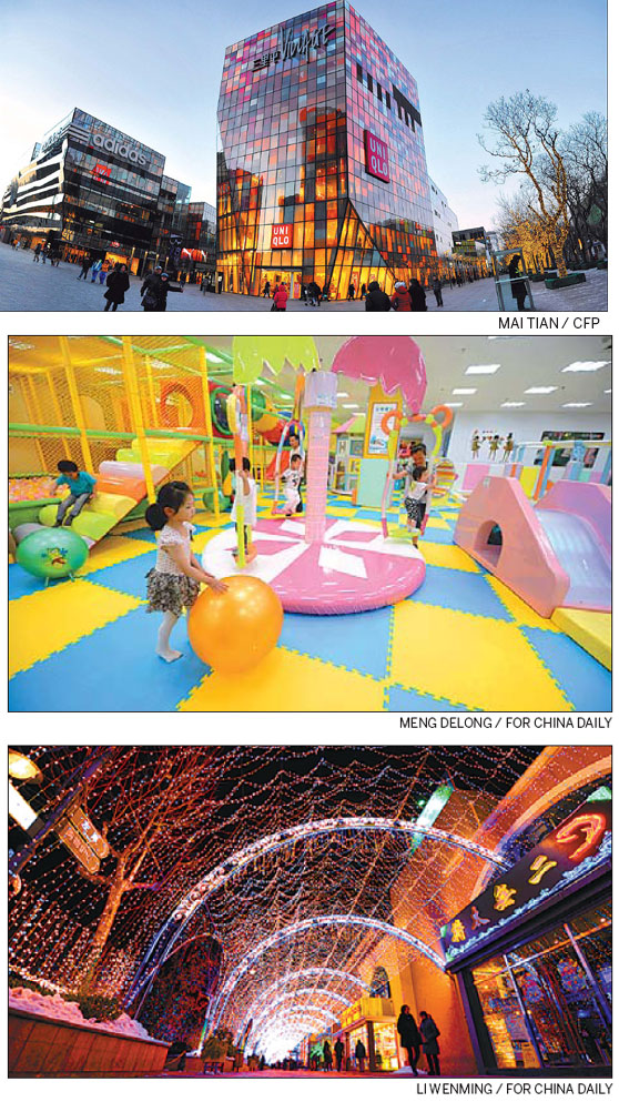 From top: Sanlitun Village is a landmark of Beijing's CBD. Childcare centers attract children and their parents to mega shopping malls. Solana Lifestyle Shopping Park is another mega shopping mall in Beijing. |