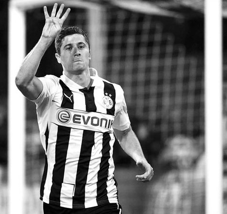 Borussia Dortmund's Robert Lewandowski gestures as he celebrates after scoring a fourth goal against Real Madrid during their Champions League semifinal first leg match at BVB stadium in Dortmund on Wednesday. Kai Pfaffenbach / Reuters