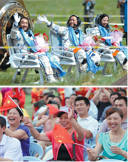 Top: (From left) Astronauts Zhang Xiaoguang, Nie Hai-sheng and Wang Yaping are welcomed after they return from a space mission and land in the Inner Mongolia autonomous region on Wednesday. Wu Yunsheng / for China Daily