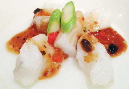 Turbot fillet, drizzled with salted black bean sauce, is the centerpiece of the meal prepared by chef Ku Chi-fai with Yu Chinese Restaurant in Beijing.