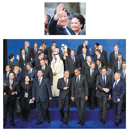 Top: President Xi Jinping and his wife Peng Liyuan greet crowds in Burg Square, Bruges, Belgium, on Tuesday. Above: World leaders, ministers and heads of international organizations gather for a picture on the second day of the two-day Nuclear Security Summit in The Hague on March 25. The world must construct a system to fight nuclear terror, with the international atomic watchdog playing a central role, a draft of the summit's final statement said. Top: Yves Logghe / Associated Press ; Above: Robin Van Lonkhuijsen / Agence France-Presse |